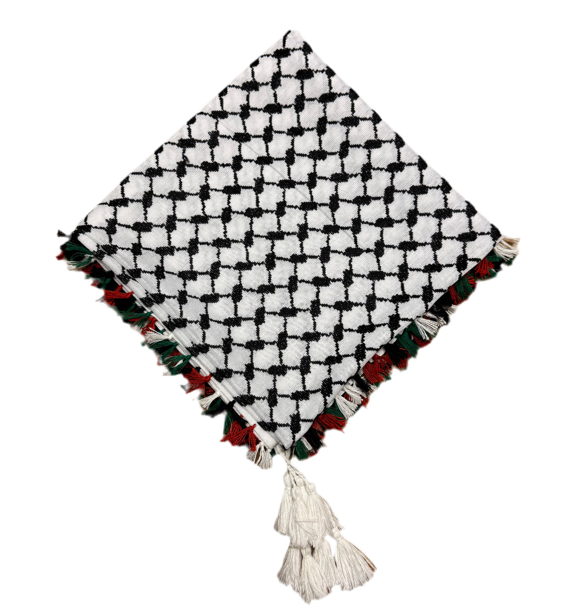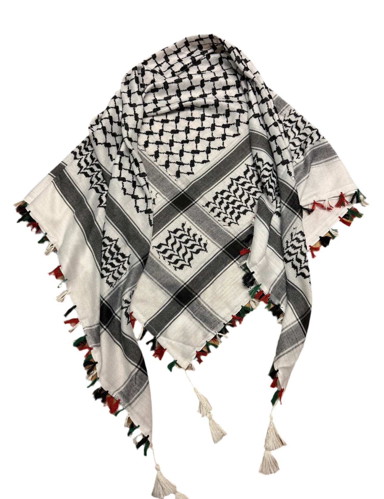 Denne kufiyehen kombinerer det tradisjonelle svarte-hvite mønsteret med dusker i de palestinske flaggfargene – svart, hvitt, rødt og grønt. Den er lett, behagelig og kan brukes både som skjerf, hodeplagg eller tilbehør. Perfekt både til hverdagsbruk og markering av solidaritet.