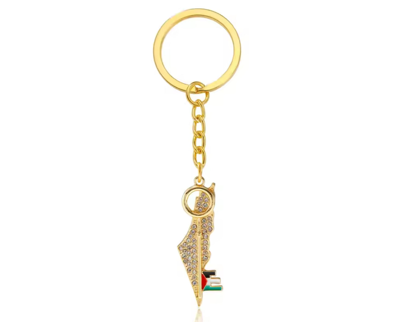 Denne unike nøkkelringen er formet som kartet over Palestina, med en nøkkel på toppen – et kraftfullt symbol på retten til å vende tilbake. Dekorert med glitrende stener og flaggets farger, blir den både et vakkert tilbehør og et tydelig statement.