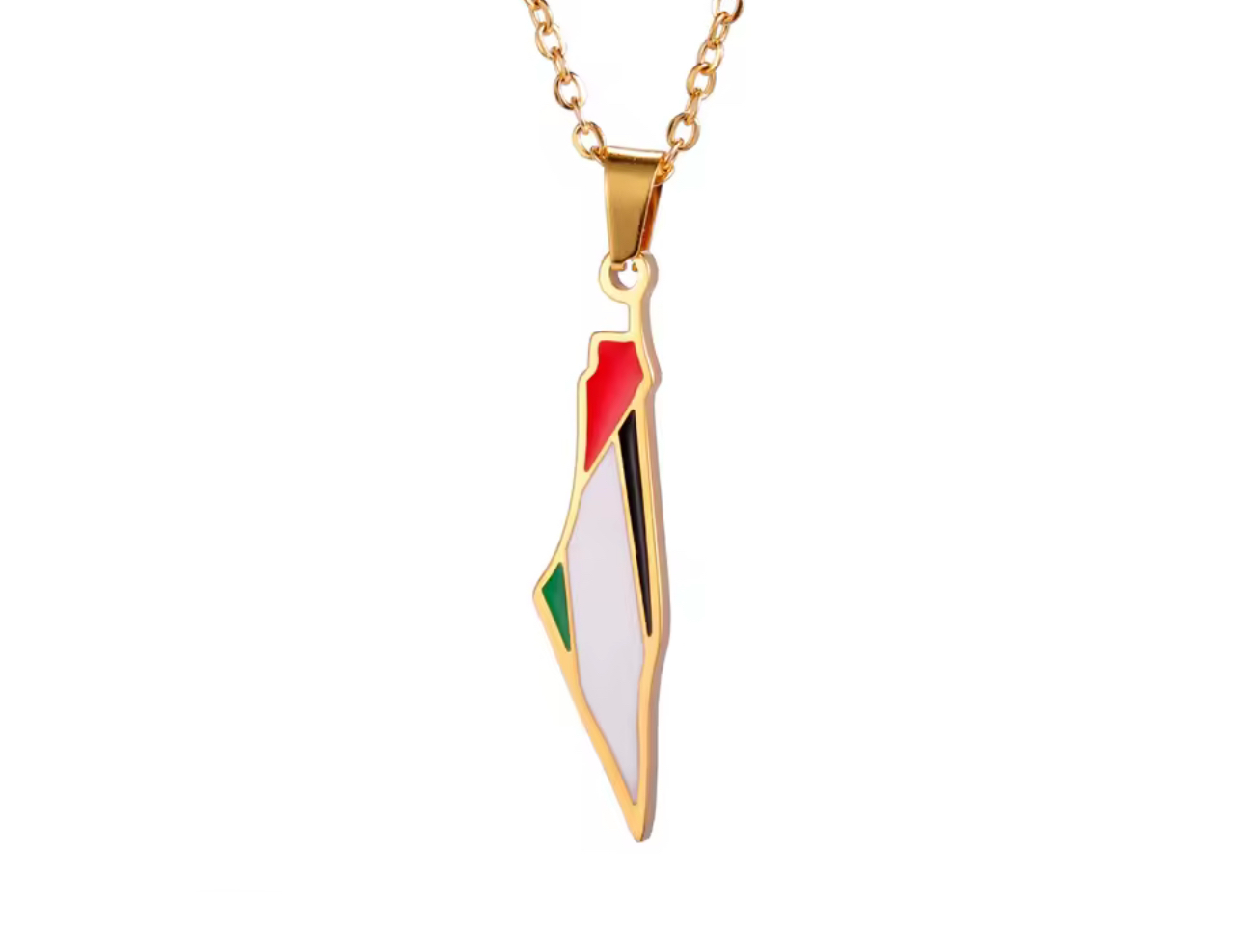 Dette vakre halskjedet er formet som kartet over Palestina – et sterkt og enkelt uttrykk for identitet og tilknytning. Designet passer både til hverdags og fest, og gjør seg like godt som personlig smykke som gave til noen du bryr deg om.