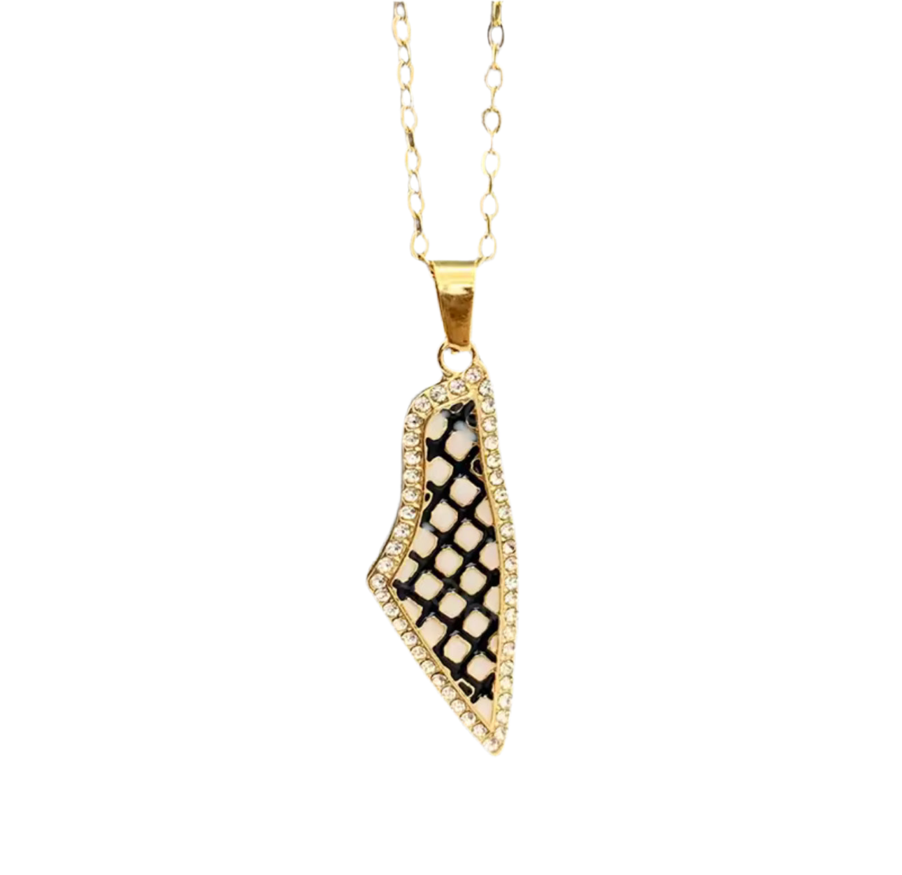 Dette halskjedet er formet som kartet over Palestina og dekorert med glitrende stener som gir et eksklusivt preg. Designet kombinerer stil og symbolikk – perfekt å bære til hverdags eller ved spesielle anledninger.